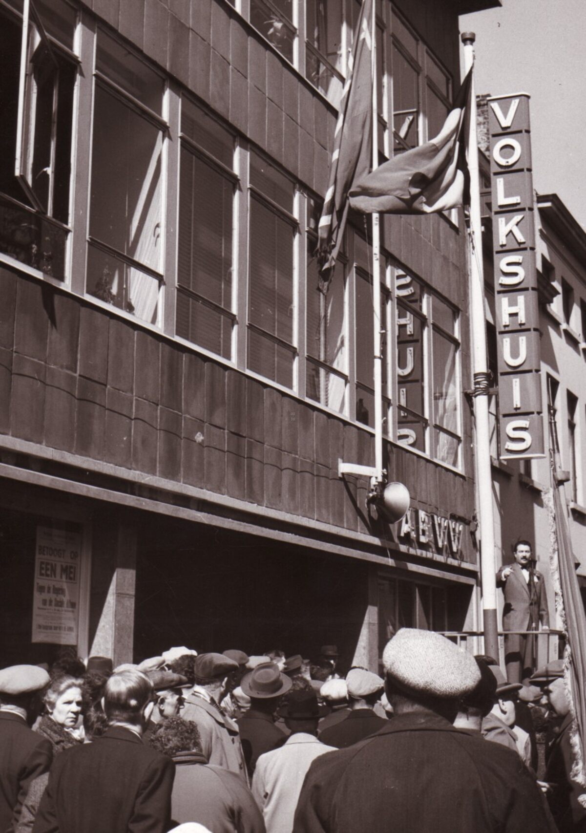 Toespraak door schepen Roger DE KINDER voor de deelnemers aan de 1-meistoet voor het partijlokaal "De Noordstar" in de Jules Peurquaetstraat.