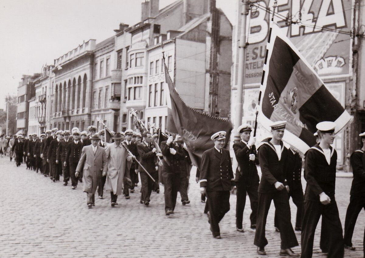 Optocht van de Vereniging van Staatszeeloodsen met vlag. Hier op de Vindictivelaan nabij het OLV College.