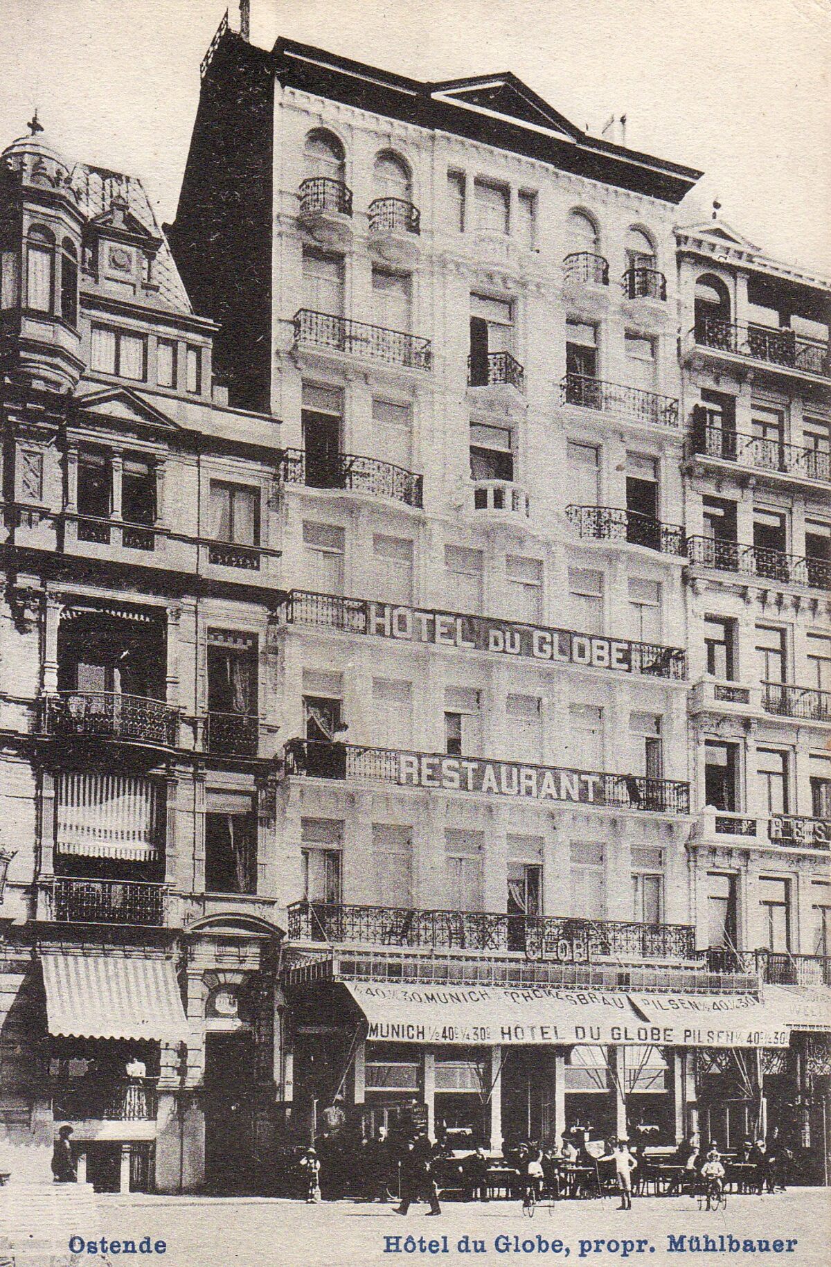 Ostende Hôtel du Globe, propr. Mühlbauer. De Zeedijk, tussen de Kursaal-Westhelling en de Berlijnstraat (huidige IJzerstraat). Links detail van Villa Emma-William en rechts detail van Hotel Wellington.
