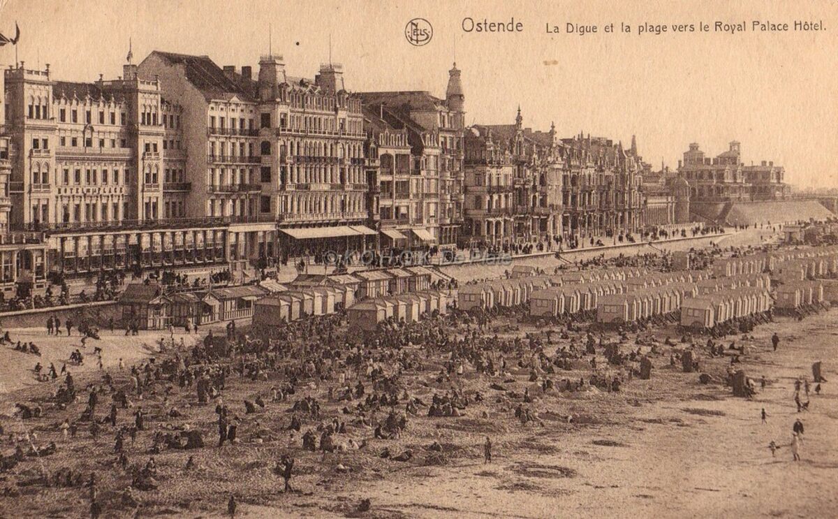 De Zeedijk gezien vanaf het Kursaal richting Koninklijk Chalet. Rechts, strandrecreatie op het Groot Strand en de traditionele badkarren. De badinstallaties zijn nog niet gebouwd. Links, Hôtel de la Plage. Oostende tijdens het interbellum