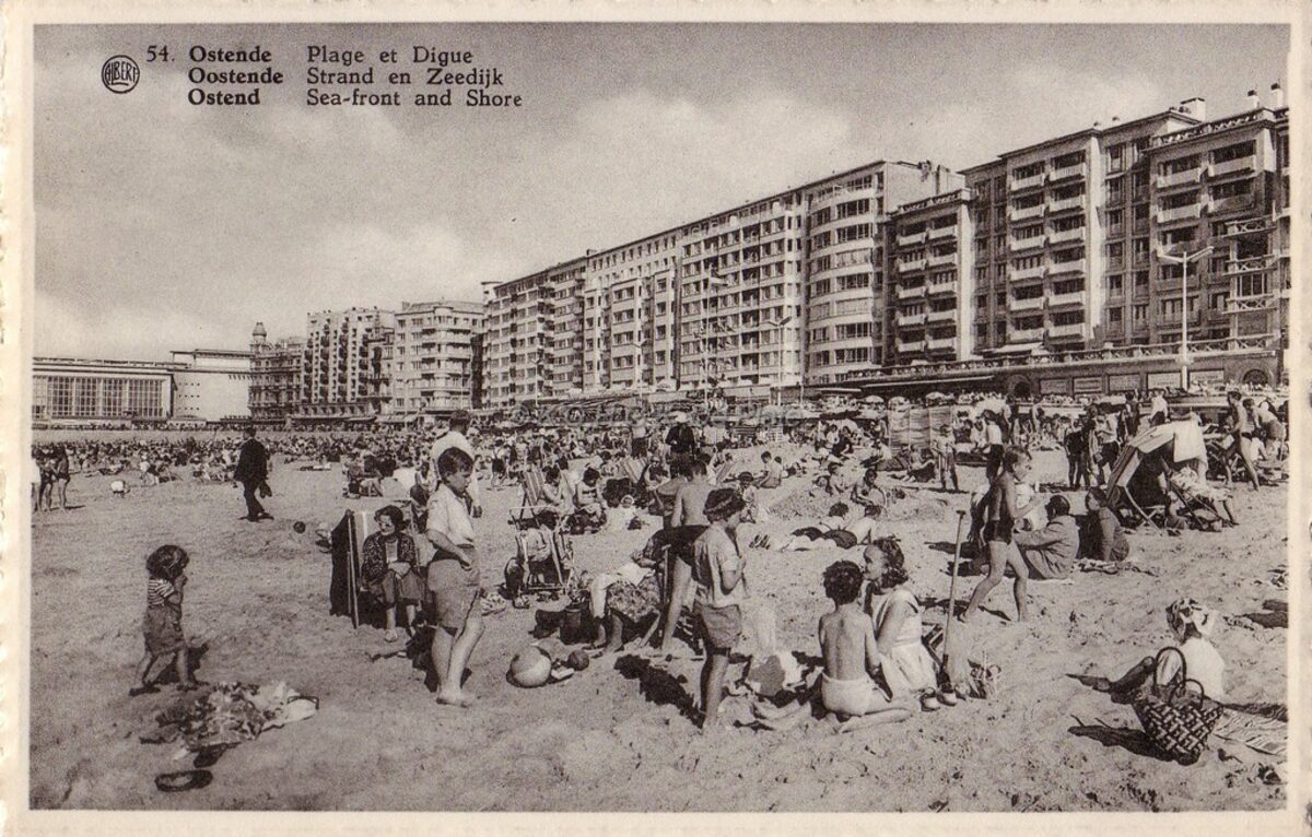 Albert Dohmen 54. - Strandrecreatie op het Groot Strand. Op de achtergrond, detail van de westgevel van het vierde kursaal en Albert I-promenade