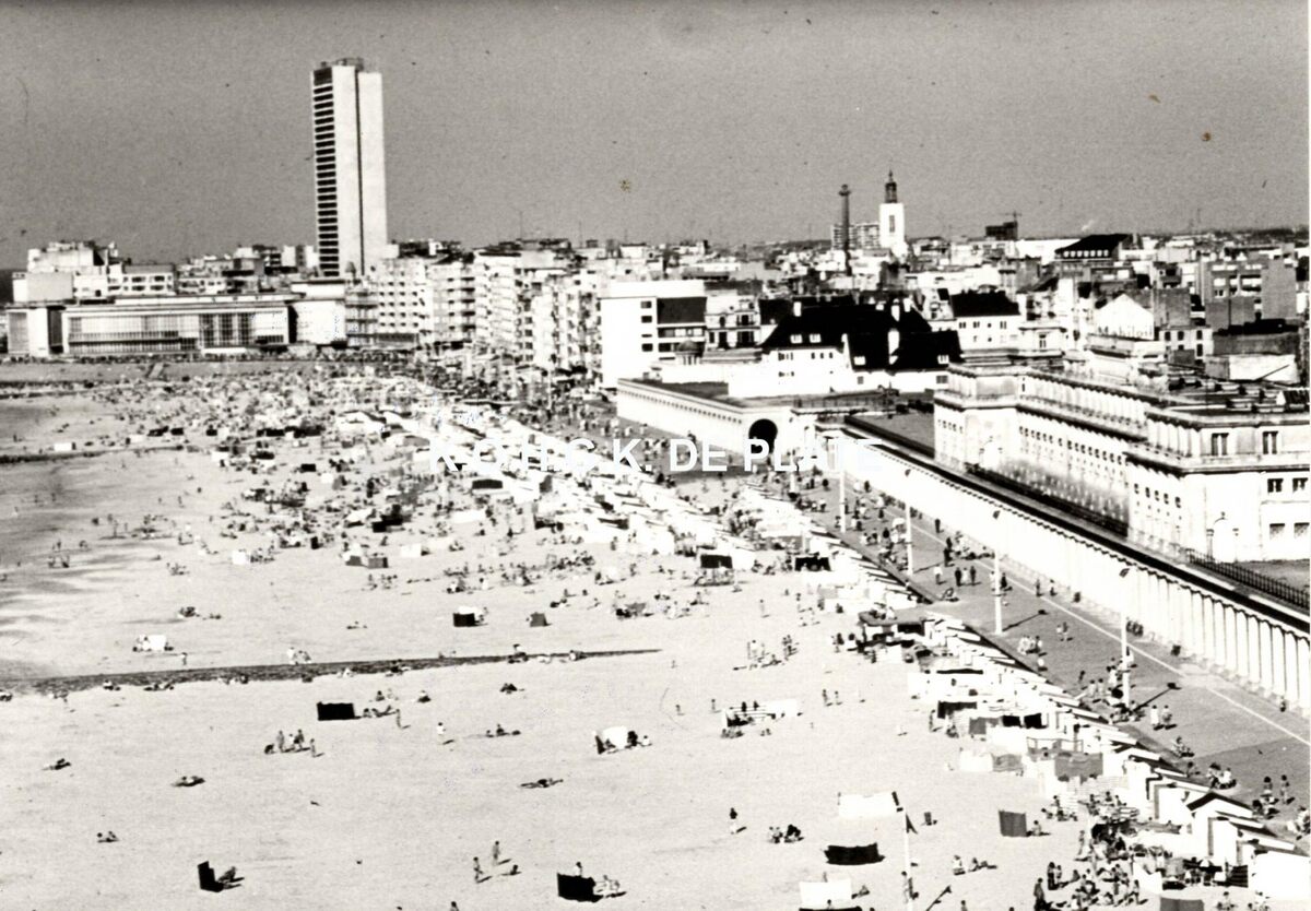 Formaat : 9 x 12,5 cm. - Strandrecreatie op het Groot Strand. Rechts, de Koninklijke Gaanderijen en het Thermae Palace Hotel. Wat verder, de Nieuwe Gaanderijen en de Koninklijke Villa. De woontoren "Europacentrum" in de Van Iseghemlaan. Links, de westgevel van het vierde Kursaal