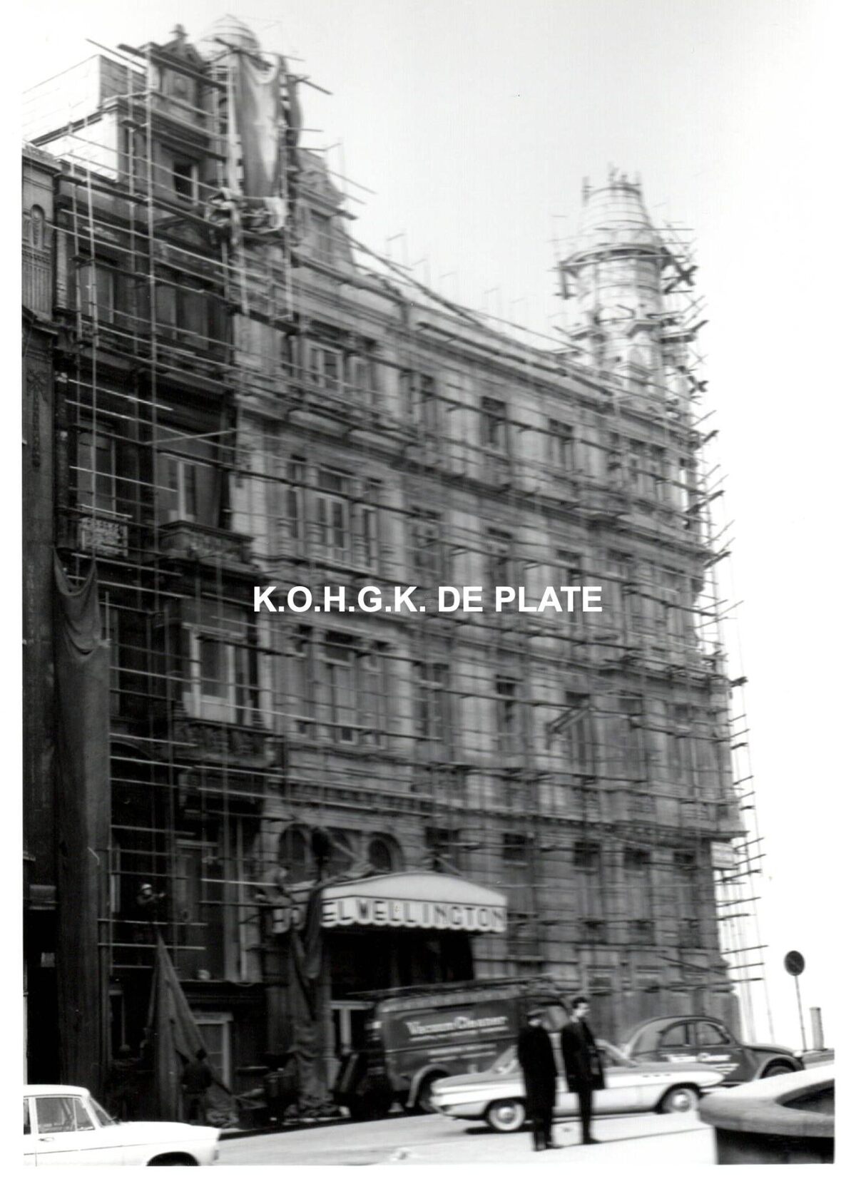 Formaat : 18 x 13 cm. - De zijgevel van hotel Wellington in de steigers