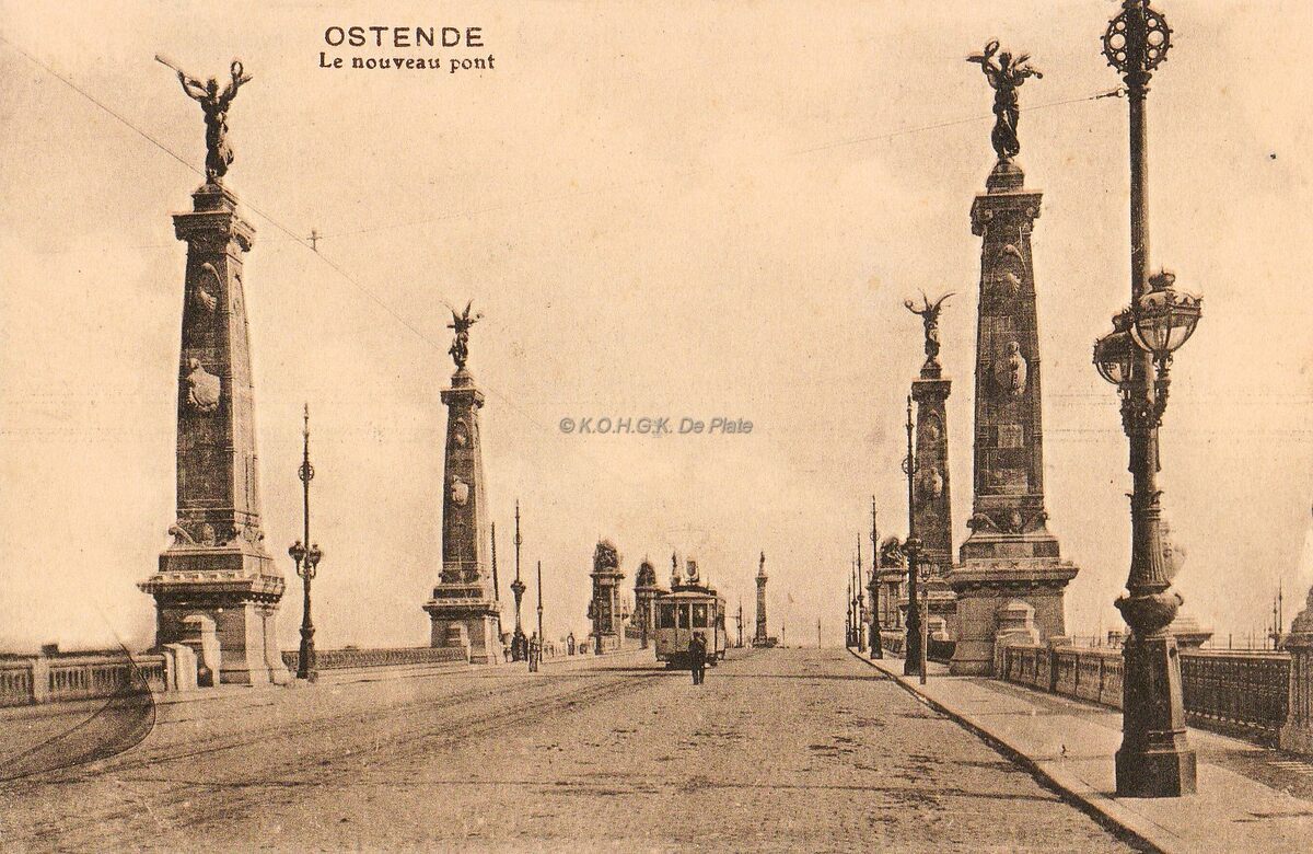 Ostende - Le nouveau pont. - Zicht op de tweede Graaf de Smet de Naeyerbrug over het afleidingskanaal en daarachter die over de spoorweg. Let op het straatmeubilair. De palen met bronzen versieringen werden in juli 1907 geplaatst om de rijdraden te dragen voor de elektrische tram naar Blankenberge die het jaar daarop zou rijden. Zij dienden tegelijkertijd voor de elektrische verlichting