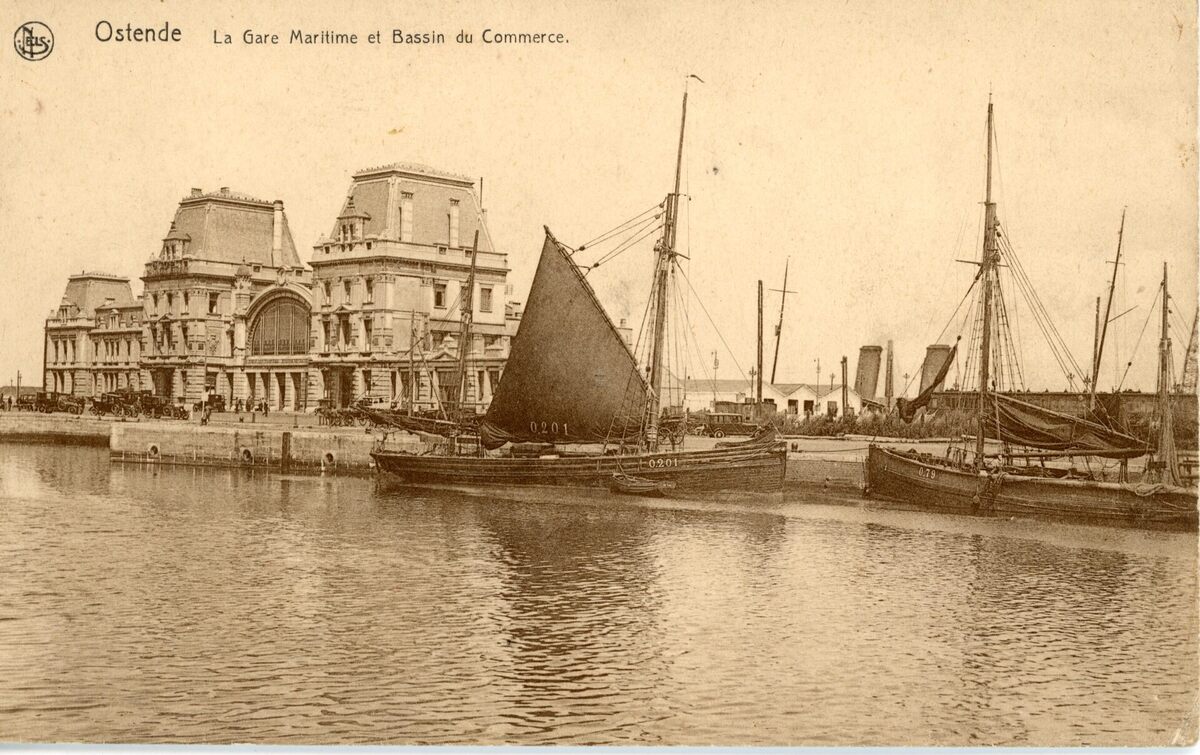 Het Zeestation en het eerste handelsdok met rechts de vissersvaartuigen O.79 Vrede (eigenaar L. de Prince en reder A. Hamman). Links de O.201 Voorzorg (eigenaar Ch. Ramon en reder A. Vandewalle.)