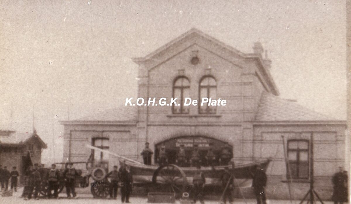 Foto 13.5 x 8.5. Voorgevel van de Bestendige Reddingsdienst, in de volksmond "De Permerensje". Redders poseren met hun reddingsboot en kar voor het gebouw, gelegen op het einde van de Visserskaai. Literatuuropgave : De zeereddingsdienst in vroegere tijden / A. Vandenbussche. Plate BIB B526