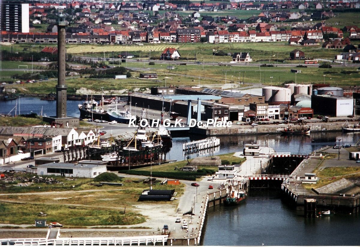 Formaat : 21 x 30 cm. - We zien de zeesluis die toegang geeft tot het Visserijdok. Links, de Slipway en de scheepswerf Seghers. De vuurtoren "Lange Nelle"