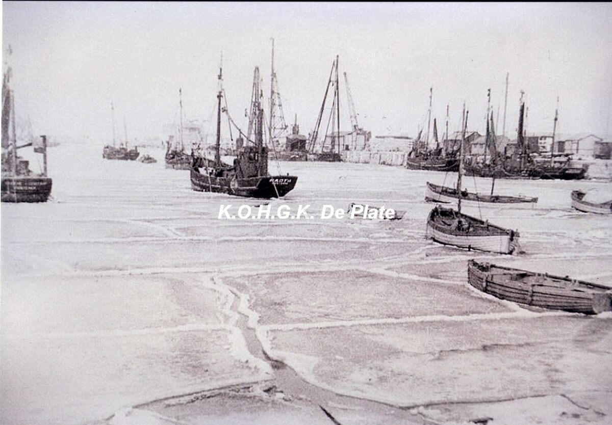 Foto (kopie), formaat : 20 x 30.(kopie). - Vissersvaartuigen in het bevroren Montgomerydok