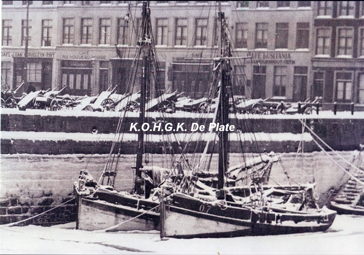 Afdruk, formaat : 30 x 20 cm. - De Visserskaai in de winter. Het gedeelte tussen het Vissersplein (links) en de Nieuwstraat (rechts). Enkele garnaalsloepen in het Schuildok. Viskarren onder de sneeuw en op de achtergrond de talrijke cafés langs de Visserskaai in het interbellum.
