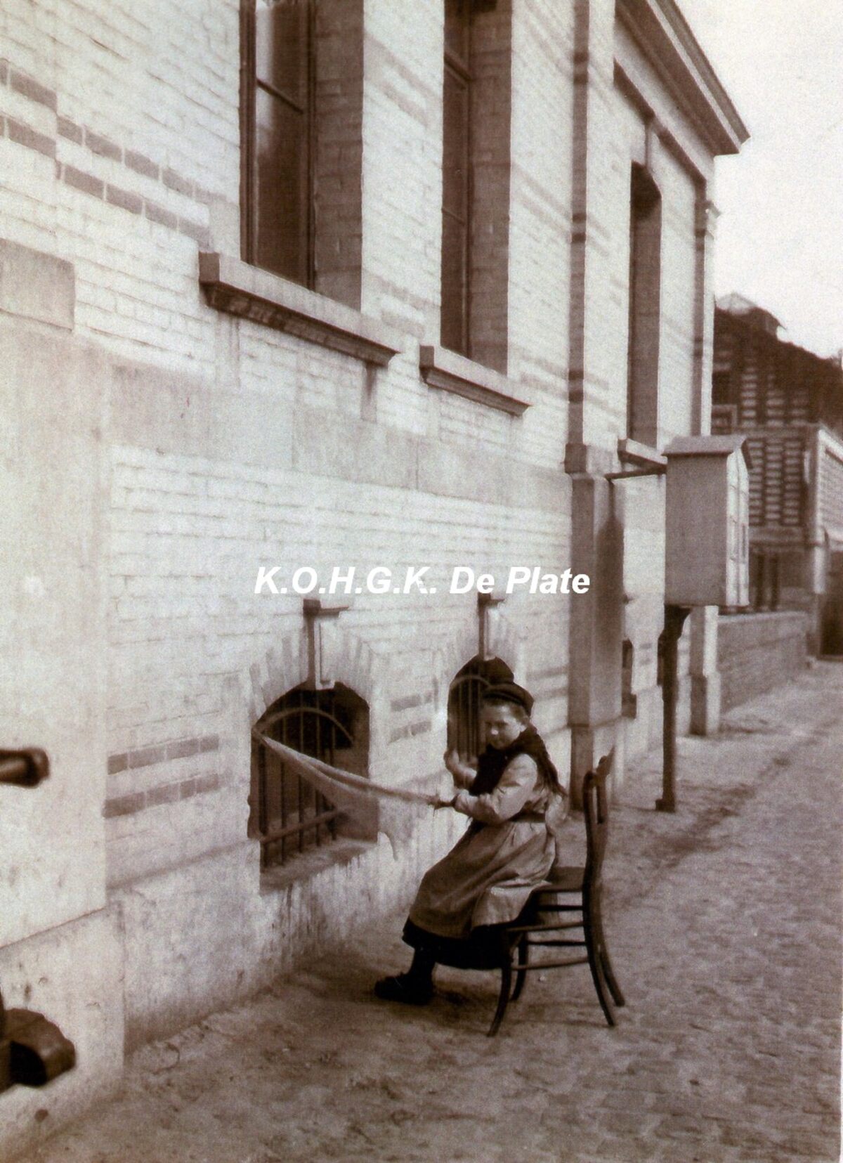 Foto (kopie), formaat : 20 x 30 cm. - Foto genomen aan de achterkant van het gebouw van de Bestendige Reddingsdienst, in de volksmond "De Permerensje". Het meisje zit met haar rug naar het Schuildok.