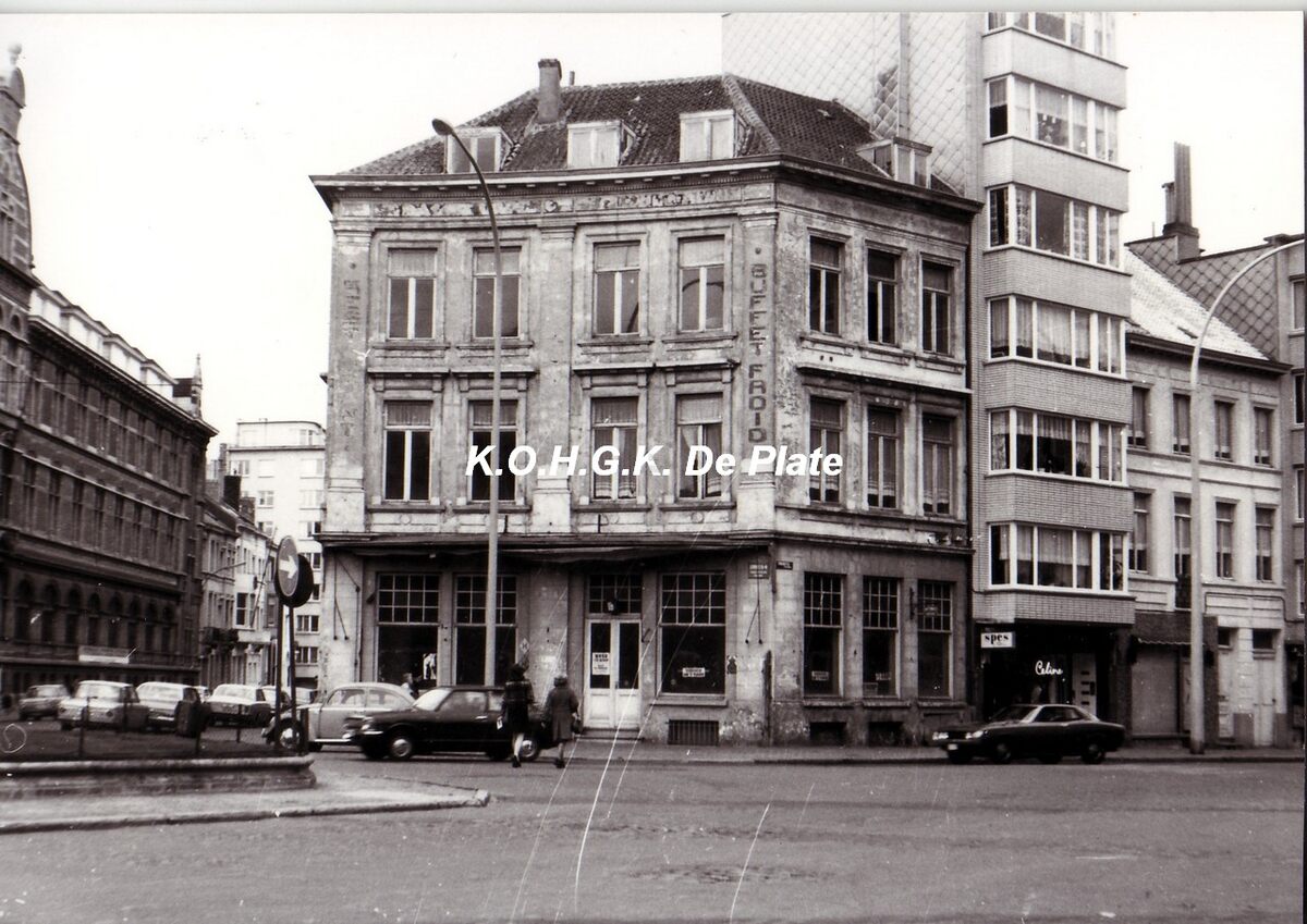 Foto 14 x 10. Hoek Torhoutsesteenweg en Rogierlaan. Het "Hôtel de Flandre", gelegen op de hoek Torhoutsesteenweg en Rogierlaan 1-3, juist voor afbraak. Links in de Rogierlaan, het Koninklijk Atheneum.