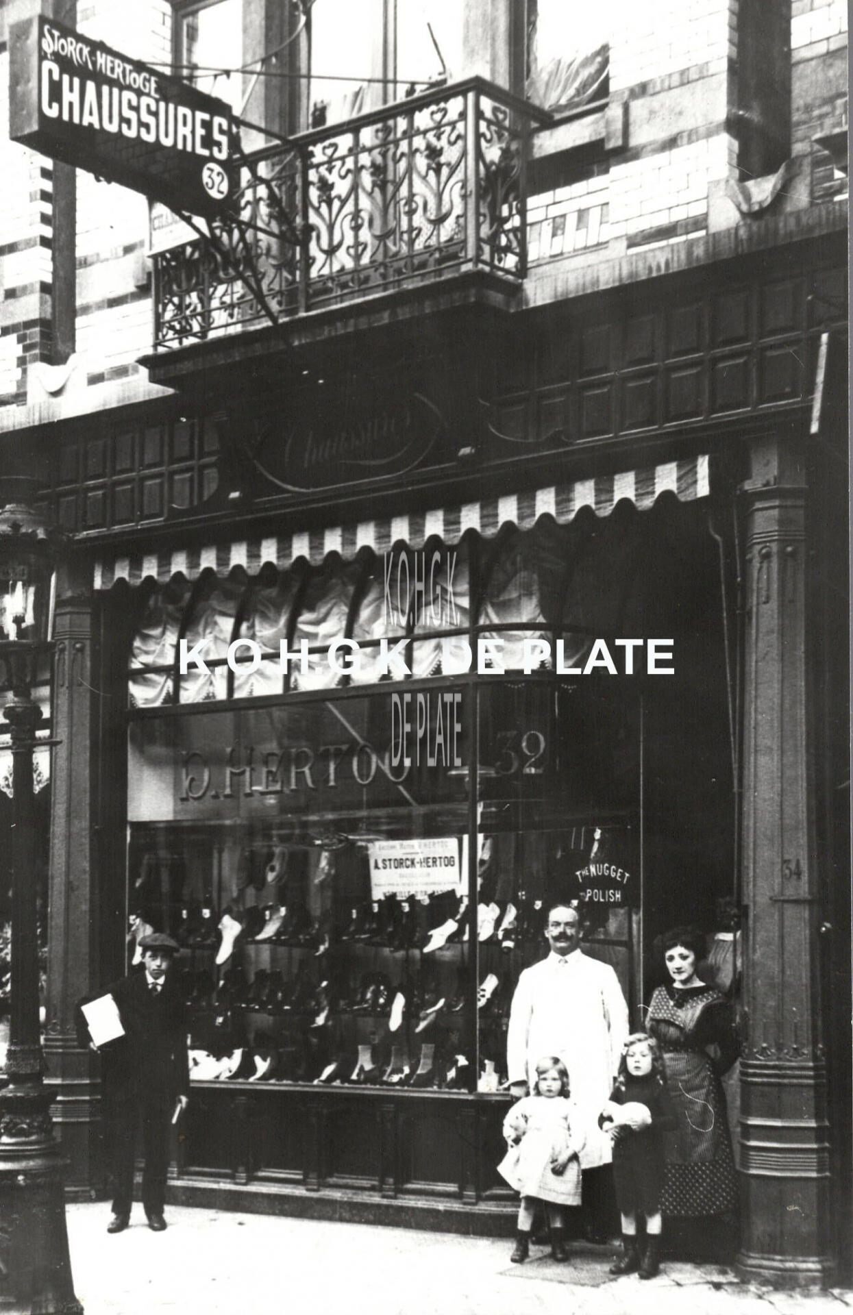 Formaat : 18 x 12 cm. - Voor de deur schoenmaker Armand Storck en zijn echtgenote Marie Jeanne Hertoge met hun kinderen, Henri de oudste zoon, rechts en naast hem zijn oudste zus Simone. Het gezin had vier kinderen : ook nog Marie Louise (°1912) en Jeanne (°1914). De naam Hertog(e) wordt op twee manieren geschreven. Op de winkelruit Hertog op het uitgangbord op de eerste verdieping Hertoge !. Op alle advertenties Hertoge ! Met dank aan Marcel Calcoen, Norbert Hostyn, Jan Nuytten, Ivan Van Hyfte. De opname is waarschijnlijk periode 1910-1913.