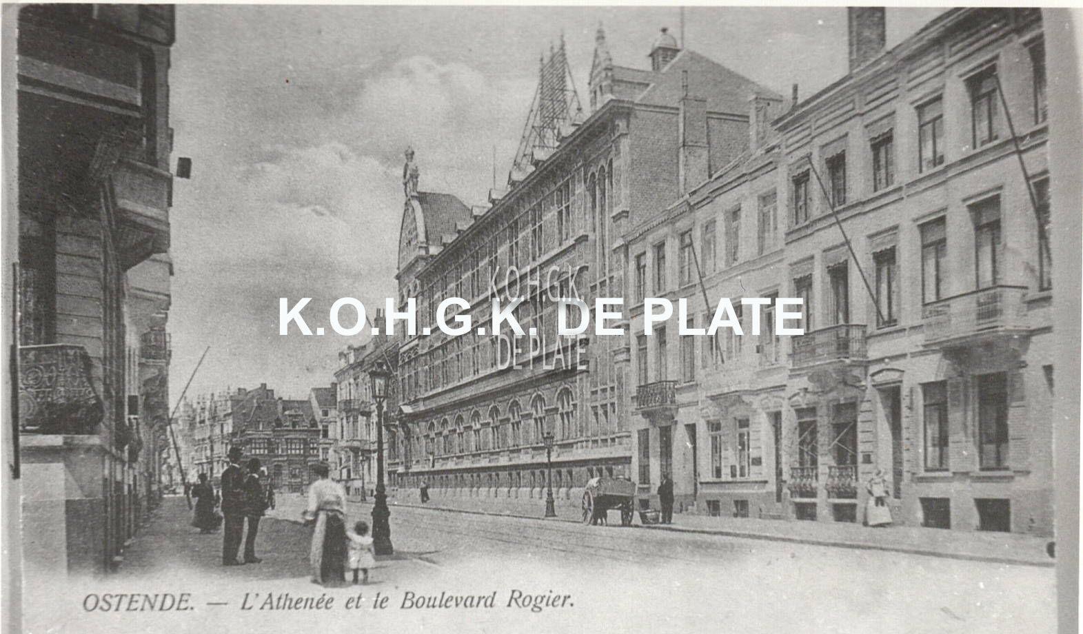 Afdruk. - Formaat :10 x 15 cm. Ostende. L'Athenée et le Boulevard Rogier. Rechts het Koninklijk Atheneum. De tramsporen van de eerste stadstram, een stoomtram. Op de achtergrond het Leopold I-plein