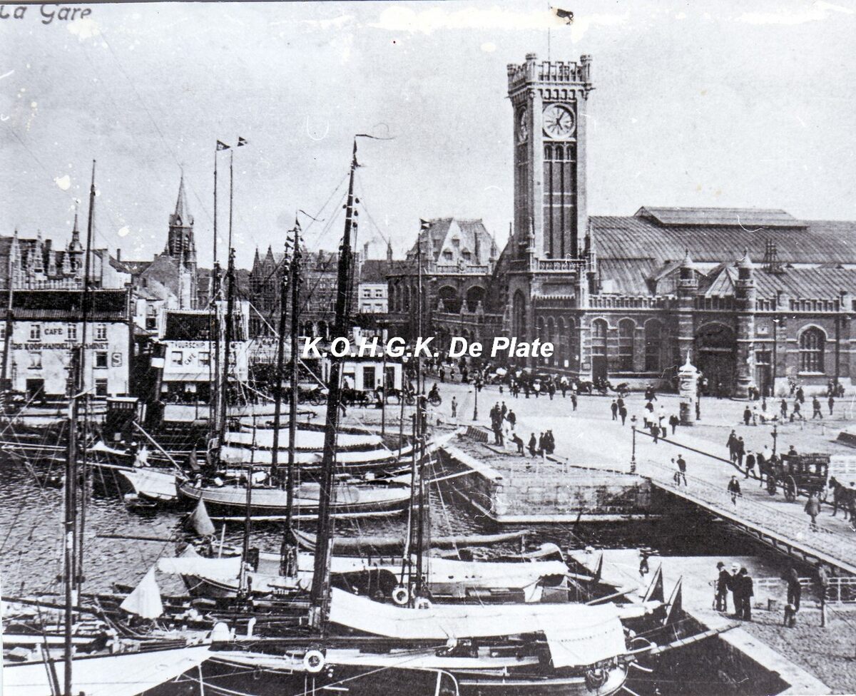 Foto 15 x 12.5. Algemeen zich op het Hazegras. Rechts het tweede spoorwegstation (Oostende-Stad), gelegen aan de Vandersweepplaats, nu Ernest Feysplein. De gebouwen gelegen aan de Keizerskaai ten zuiden van het eerste handelsdok zijn, van links naar rechts, de cafés "De Koophandel" en "In 't Vuurschip" en het oud politiekantoortje.