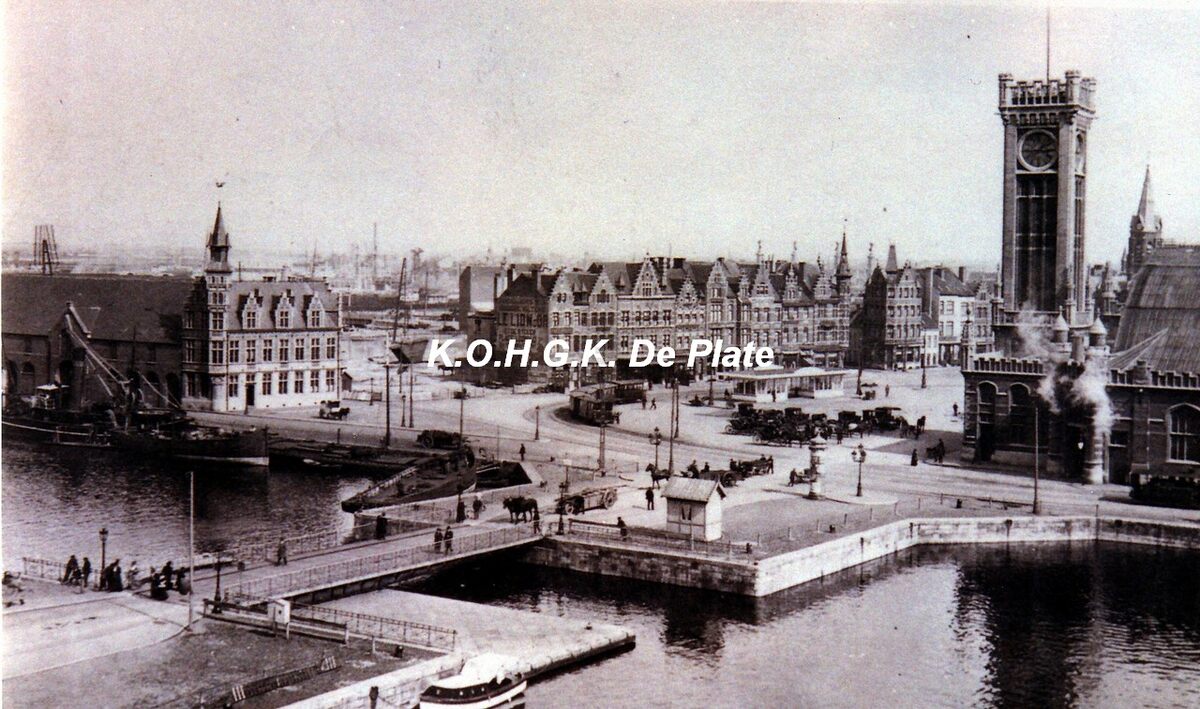 Foto 14 x 9. Algemeen zicht op het Hazegras.Vooraan het eerste en tweede handelsdok met de Kapellebrug. Rechts, het tweede spoorwegstation (Oostende-Stad) gelegen aan de Vandersweepplaats. Een tram nabij het wachthuisje.
