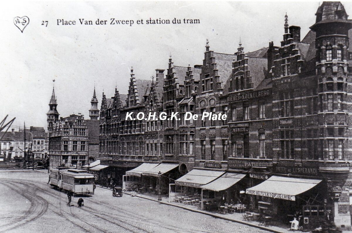 Afdruk van postkaart, formaat : 14.5 x 10.5 cm. - Place Van der Zweep et station du tram. Inspelend op de stationsfunctie, huizenrij gebouwd in de neo-Vlaamse renaissancestijl in de periode 1901-1909 door verschillende architecten o.a. : op de achtergrond het politiekantoor met hoektorentje naar ontwerp van Gustaaf Vandamme, afgebroken in 1955 voor de aanleg van de Leopold III-laan. Van architect Achille-Emile Raoux, de gebouwen Vandersweepplaats nr.5, "Direction & Bureaux Tramway Electrique" en nr.6 "Hôtel de l'Avenir".