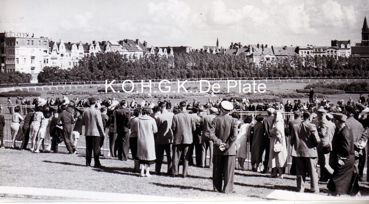 Foto 18 x 10. Veel volk op de Wellingtonrenbaan rond de paddock. In de achtergrond de Sportstraat