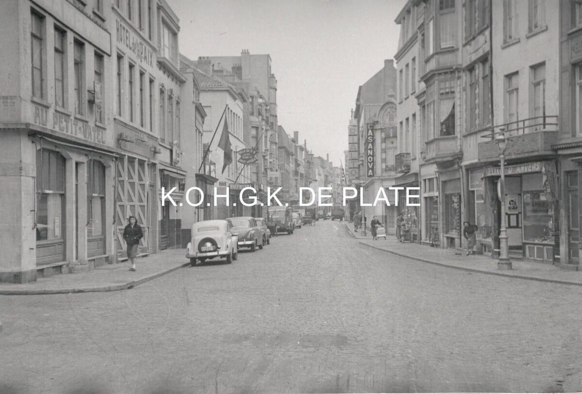 Formaat : 12 x 17 cm. - Rechts het gedeelte gezien vanaf de Madridstraat met dancing "Casanova" op de hoek van de Hertstraat en wat verder cinema "Rialto". Links op de hoek met de Antoon Belpairestraat café "Au Petit-Vatel", ernaast "Hôtel de la Paix".