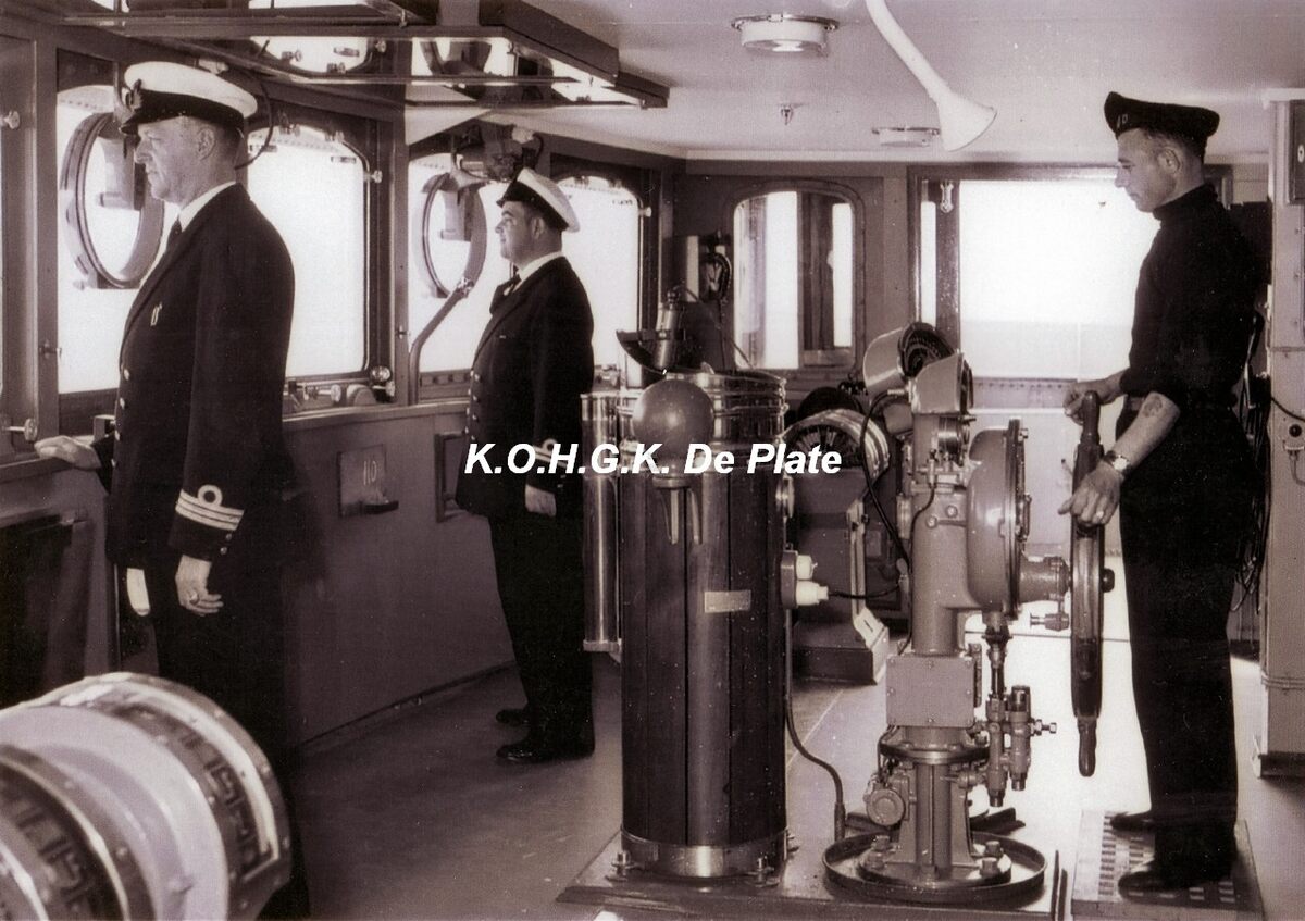Afdruk, formaat : 29.5 x 21 cm. - De brug, met uiterst links commandant Spoelders. Links vooraan de telegraaf en in het midden het magnetisch standaardkompas.