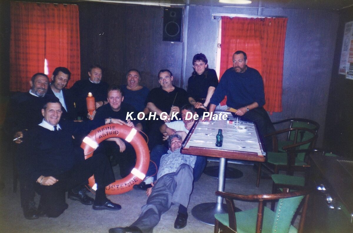 Foto (kopie) : 29.5 x 21 cm. Enkele bemanningsleden van de carferry "Reine Astrid" ex "Stena Nautica". Links, tweede persoon, Prosper Jooris.