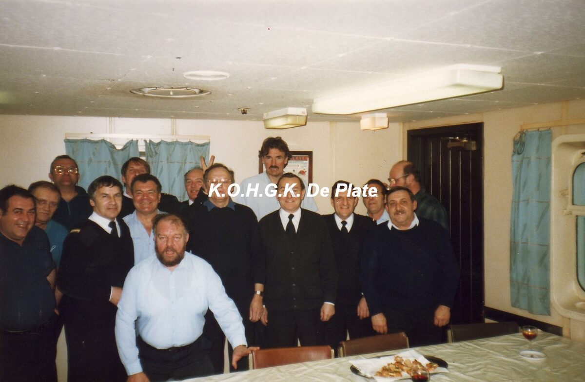 Afdruk, formaat : 29.5 x 21 cm. - De bemanningsleden van de carferry "Prins Albert". Derde persoon links, Daniël Vanleke en vierde, J. Butseraen. Rechts, vierde, bootsman, Prosper Jooris en vijfde, commandant Jan Van Caenegem.