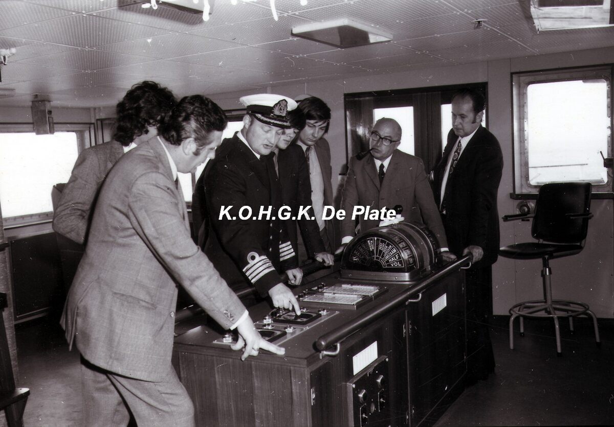 Afdruk, formaat : 29.5 x 21 cm. - De brug. Commandant Roland Bedert geeft uitleg aan enkele genodigden op de brug van de carferry "Prins Philippe". Uiterst rechts, R. Pitteljon, commercieel afgevaardigde in Londen.
