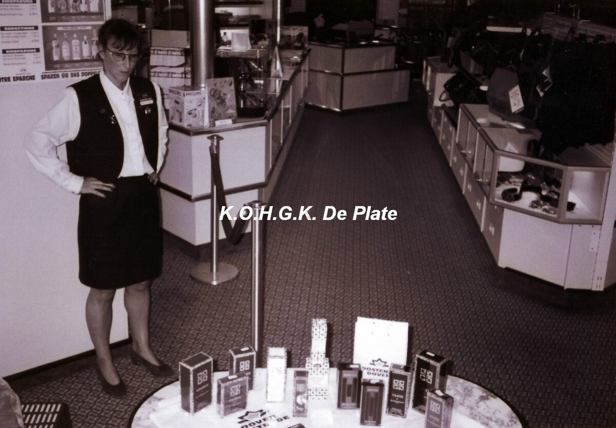 Afdruk, formaat : 29.5 x 21 cm. - De shop van de carferry "Prins Filip" met de winkeldame, Gwendoline Devriendt