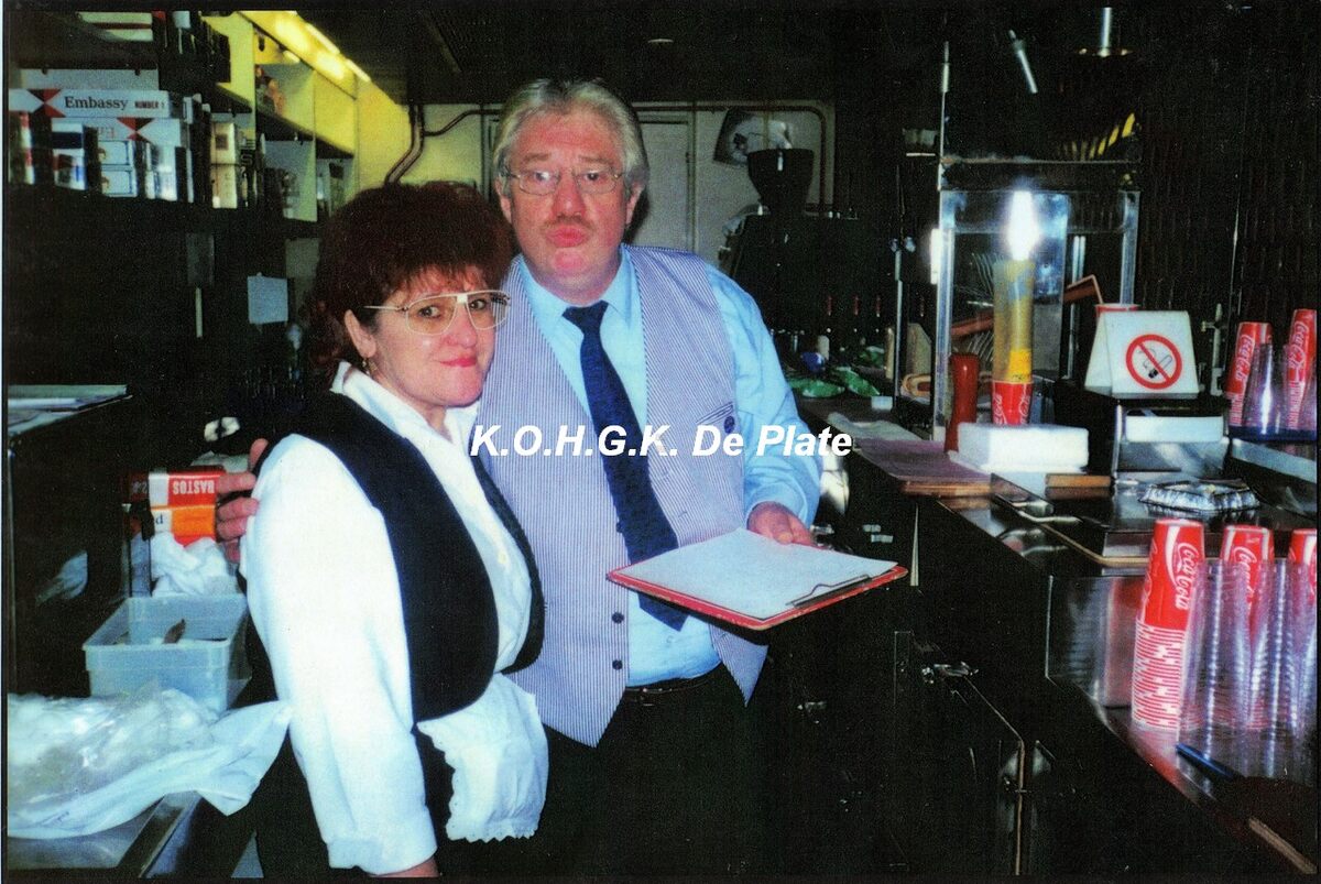 Foto (kopie) : 29.5 x 21 cm. - De bar van de (?) met een stewardess en barman, Robert Van Houtte van de catering Wagon-Lits (gegevens Arne Pyson)