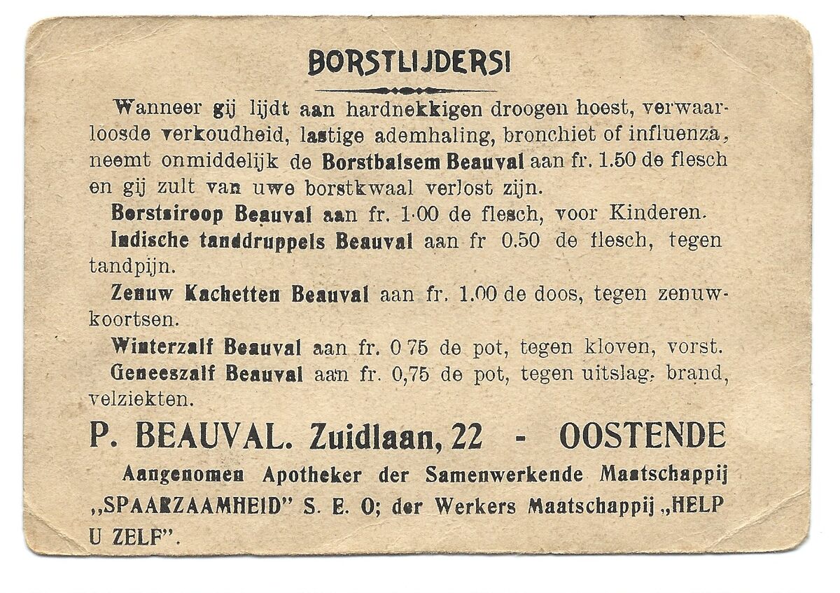 Borstlijders !. Wanneer gij lijdt aan hardnekkigen droogen hoest, verwaarloosde verkoudheid, lastige ademhaling, bronchiet of influenza, neemt onmiddelijk de Borstbalsem Beauval aan fr. 1.50 de flesch en gij zult van unwe borstkwaal verlost zijn. Borstsiroop Beauval aan fr. 1.00 de flesch voor Kinderen. Indische tanddruppels Beauval aan fr. 0.50 de flesch, tegen tandpijn. Zenuw Kachetten Beauval aan fr. 1.00 de doos, tegen zenuwkoortsen. Winterzalf Beauval aan fr. 0.75 de pot, tegen kloven, vorst. Geneeszalf Beauval aan fr. 0.75 de pot, tegen uitslag, brand, velziekten. P. BEAUVAL.