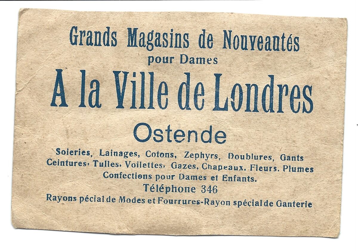 Grands Magasins de Nouveautés pour Dames A la Ville de Londres. Ostende. Soieries, Lainages, Cotons, Zphyrs, Doublures, Gants, Ceintures, Tulles, Voillettes, Gazes, Chapeaux, Fleurs, Plumes, Confections pour Dames et Enfants. Téléphone 346. Rayon spécial de Modes et Fourrures. Rayon spécial de Ganterie. - Map Recl 25-32