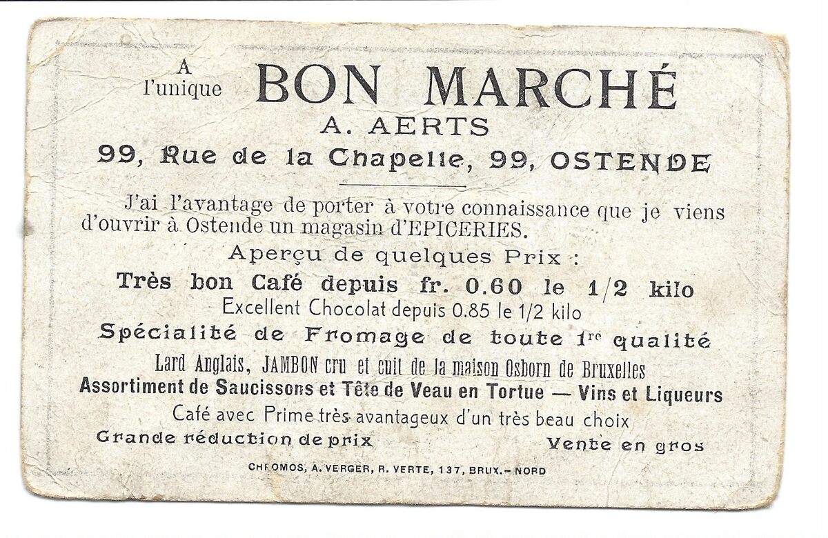 J'ai l'avantage de porter à votre connaissance que je viens d'ouvrir à Ostende un magasin d'Epiceries. A perçu de qualques Prix : Très bon Café depuis fr. 0.60 le 1/2 kilo. Excellent Chocolat depuis 0.85 le 1/2 kilo. Spécialité de Fromage de toute 1re qualité. Lard Anglais, Jambon crue et cuit de la la maison Osborn de Bruxelles. Assortiment de Saucissons et Tête de Veau en Tortue - Vins et Liqueurs. Café avec Prime très avantageux d'un très beau choix. Grande réduction de prix. Vente en gros. - Map Recl 34