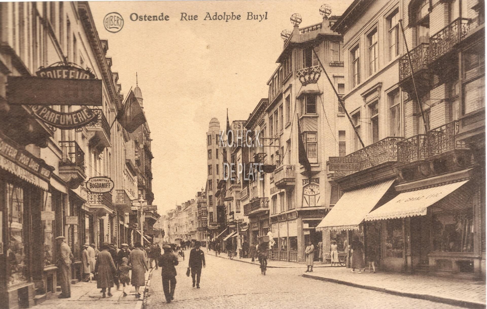 Formaat : 9 x 14 cm. - Albert. Phototypie, A. Dohmen, Bruxelles. - Ostende - Rue Adolphe Buyl. - Op de hoek met de Hertstraat de "Internationale Boekhandel".