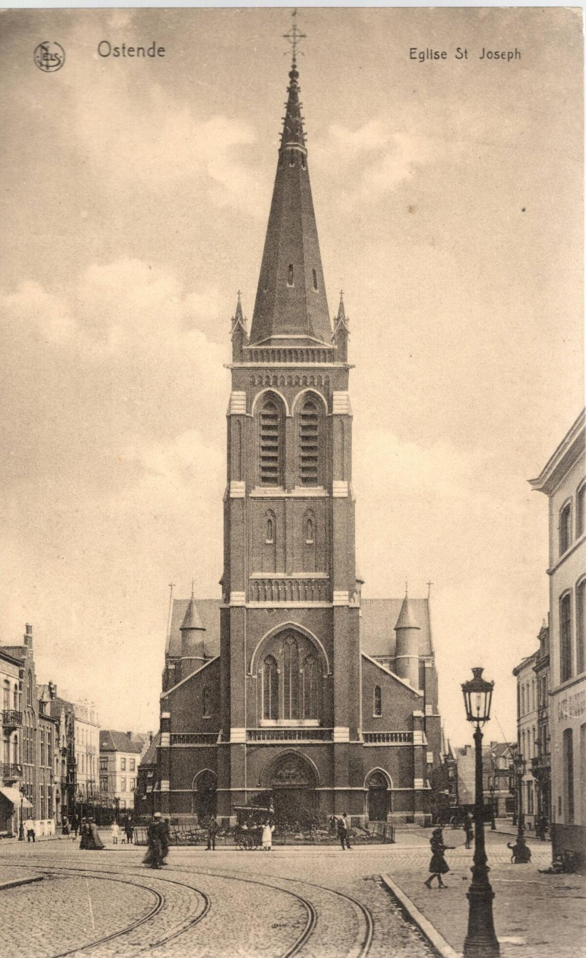 Formaat : 14 x 9 cm. - Nels. Ern. Thill, Bruxelles. - Ostende - Eglise St Joseph. - De kerk gezien vanuit de Rogierlaan met de hoek van de Alfons Pieterslaan.