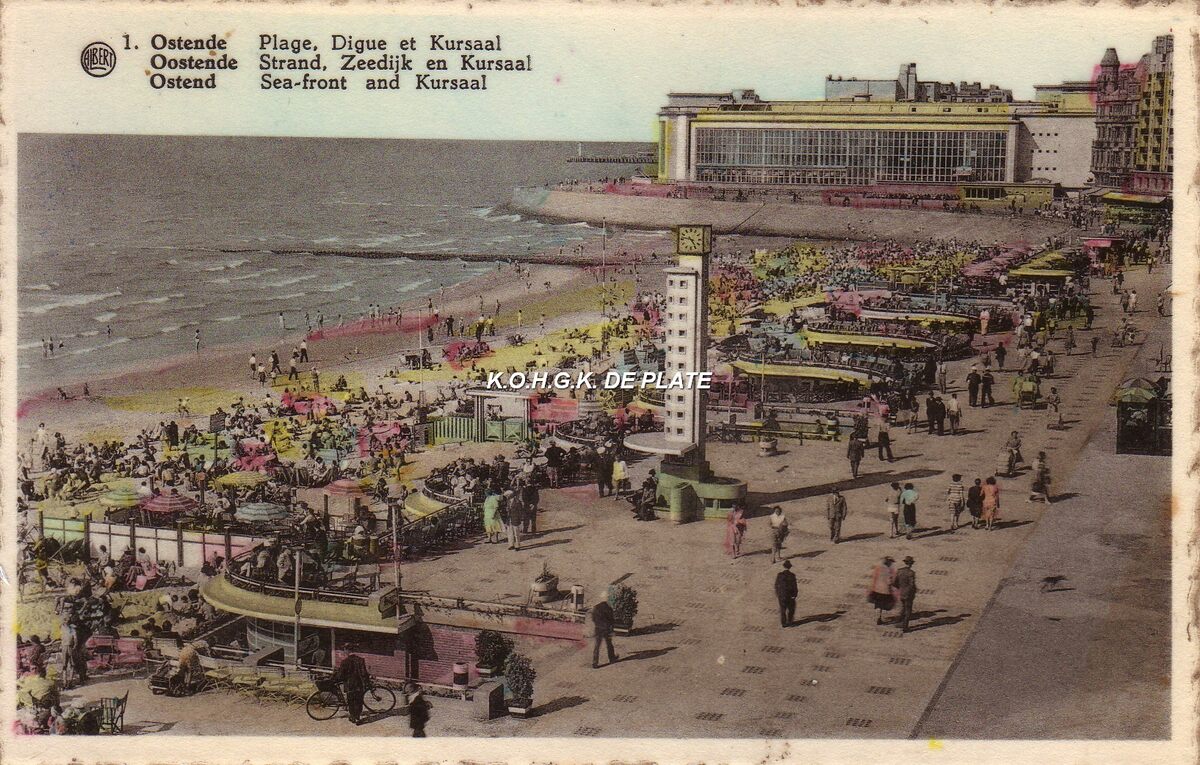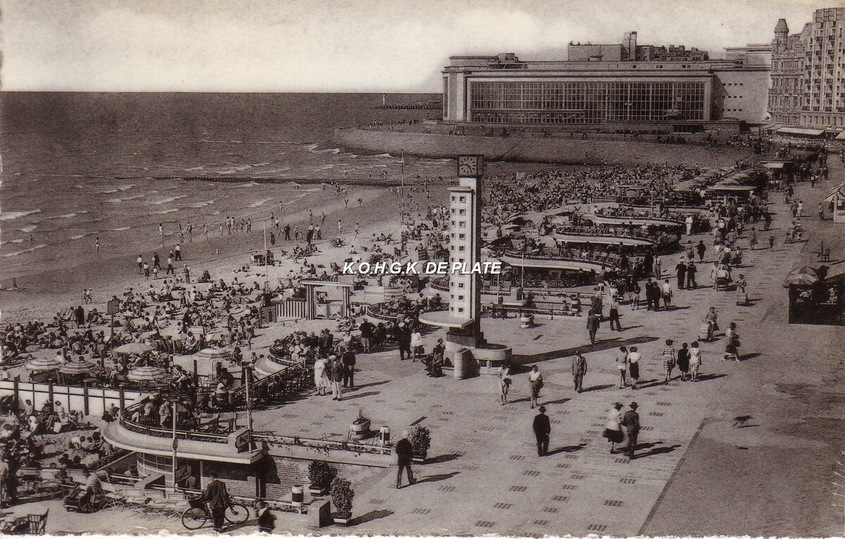Albert 1 - Plage digue et Kursaal. Strand zeedijk en kursaal. Sea-front and kursaal. - Strandrecreatie op het Groot Strand nabij de badinstallaties onder de Albert I-Promenade. Op het einde, de westgevel van het vierde Kursaal.
