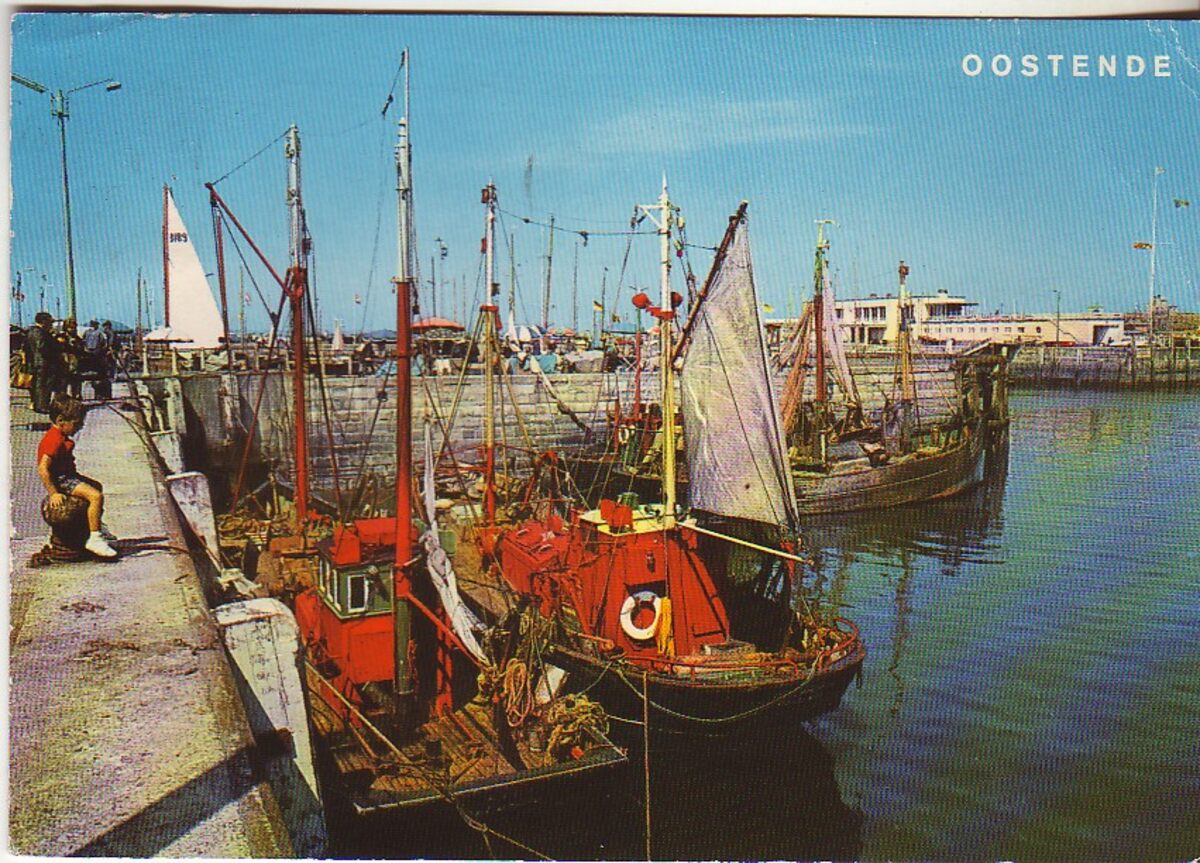 Postkaart AVM. - Vissersvaartuigen gemeerd in het Montgomerydok langs de Visserskaai nabij de Vistrap. Wat verder, het gebouw van de North Sea Yachtclub aan de Montgomerykaai.