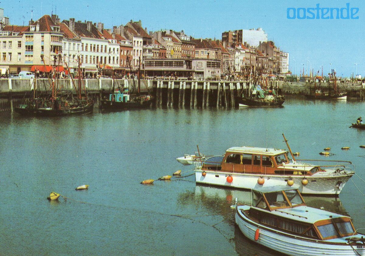 Pluscolor, N° OS 11. - Vissersvaartuigen gemeeerd in het Montgomerydok. Vooraan, enkele pleziervaartuigen. Links, de Visserskaai en de Garnaalmijn, nu Noordzeeaquarium, gelegen rechtover het Vissersplein