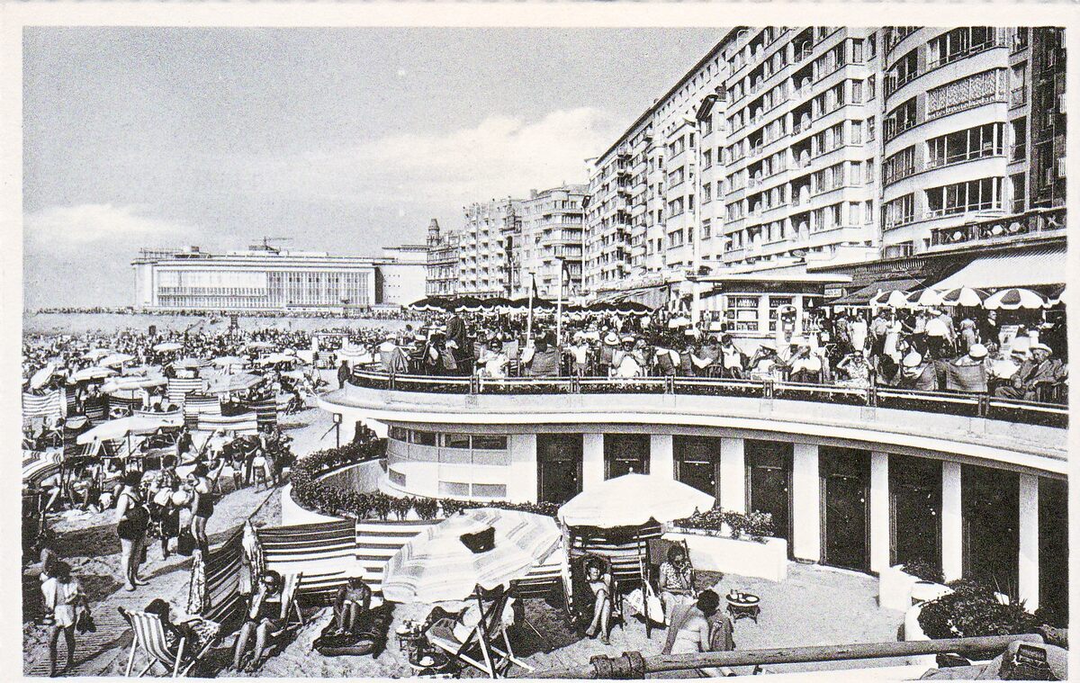 Nels. - Strandrecreatie op het Groot Strand nabij de badinstallaties onder de Albert I-promenade. Op de achtergrond, de westgevel van het vierde Kursaal.