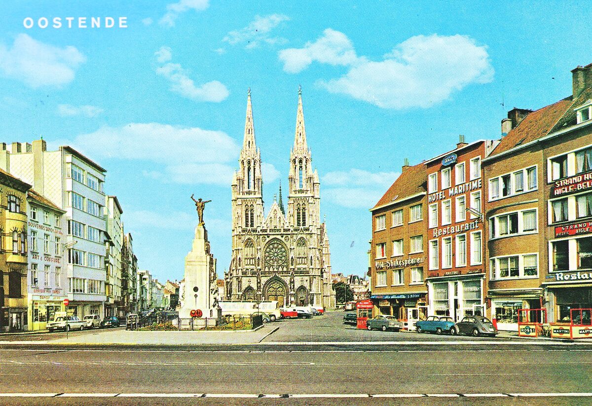 Van Mieghem A., N°11. - Het Sint Petrus en Paulusplein, met vooraan, het oorlogsmonument voor de gesneuvelde Oostendse burgers en militairen. Rechts, Hotel Maritime en hostellerie Old Shakespeare. Op de achtergrond, de Sint Petrus en Pauluskerk