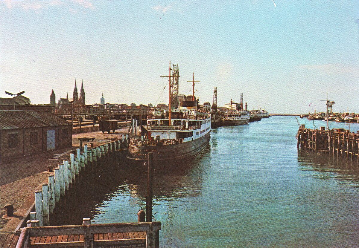 Postkaart JC. - Le port. - Mooi zicht op de havengeul met vooraan de pakketboot "Prince Philippe", gemeerd nabij het Zeestation. Op de achtergrond, de twee torens van de Sint Petrus en Pauluskerk en links ernaast, de toren ook "Peperbusse" genaamd van de door brand vernielde Sint Pieterskerk.