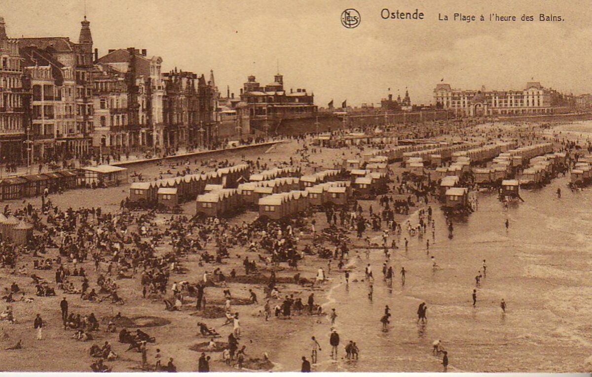 Nels, serie 13, nr 43. - Ostende - La plage à l'heure des Bains - Strandrecreatie op het Groot Strand. De Zeedijk ten westen van het Kursaal, met de grote hotels en in het midden het Koninklijk Chalet. Op het einde het Royal Palace Hotel