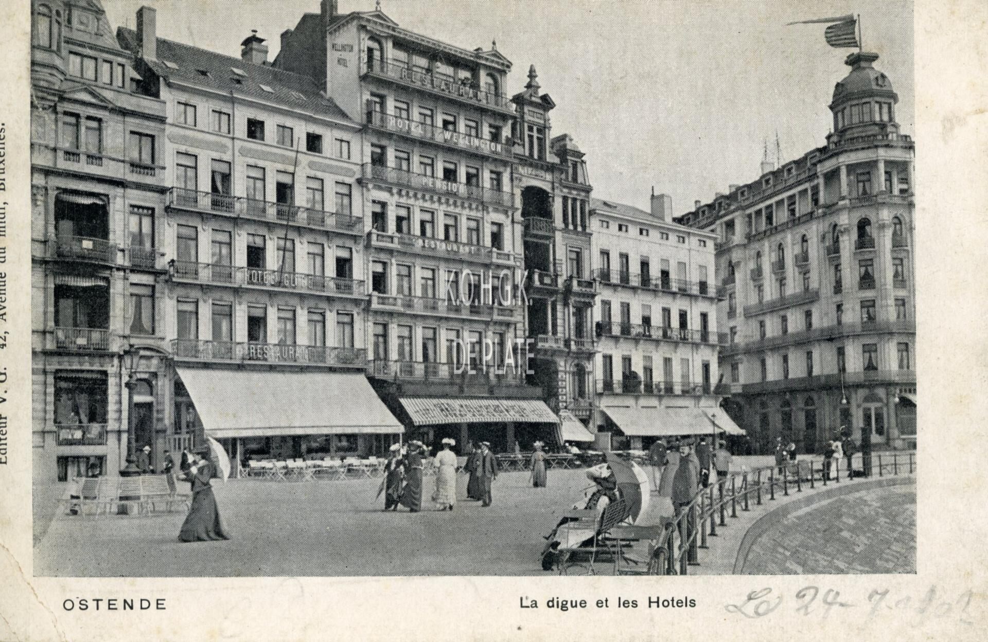 Edit. V.G. [=Victor Grégoire], 42, Avenue du Midi, Bruxelles. - Ostende - La digue et les hôtels. Oostende in de Belle Epoque. Van rechts naar links, op de hoek met de Berlijnstraat, Hôtel Continental en Hôtel Helvetia, Hôtel Frank, Hôtel Wellington en Hôtel du Globe