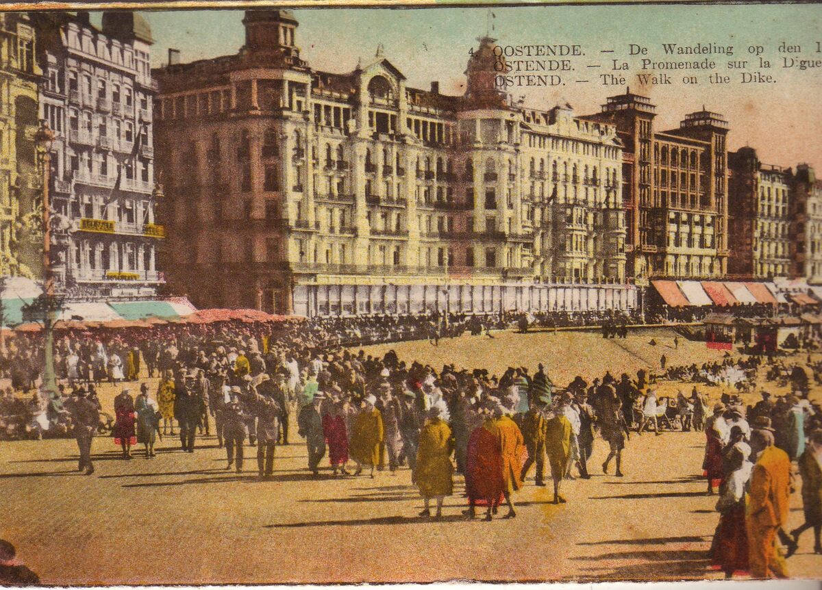 C.D. - Oostende - De wandeling op den dijk. Ostende - La Promenade sur la Digue. Ostend - The Walk on the Dike. Ingekleurde kaart