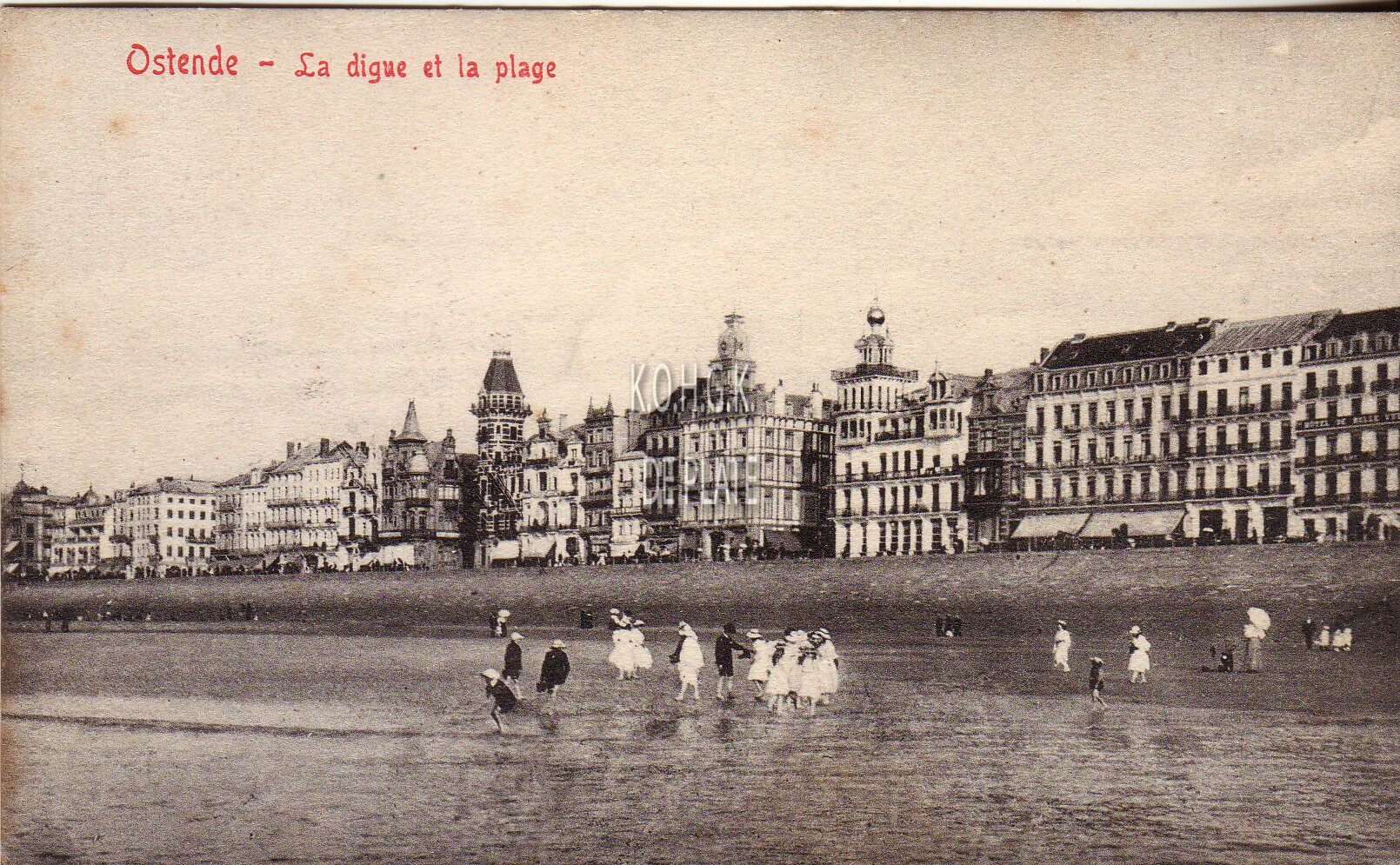 Edit. V.G. [=Victor Grégoire], 42, Avenue du Midi, Bruxelles. - Ostende - La digue et la plage. - De Zeedijk, gezien vanaf het Groot Strand. Pootjebaden langs de vloedlijn.