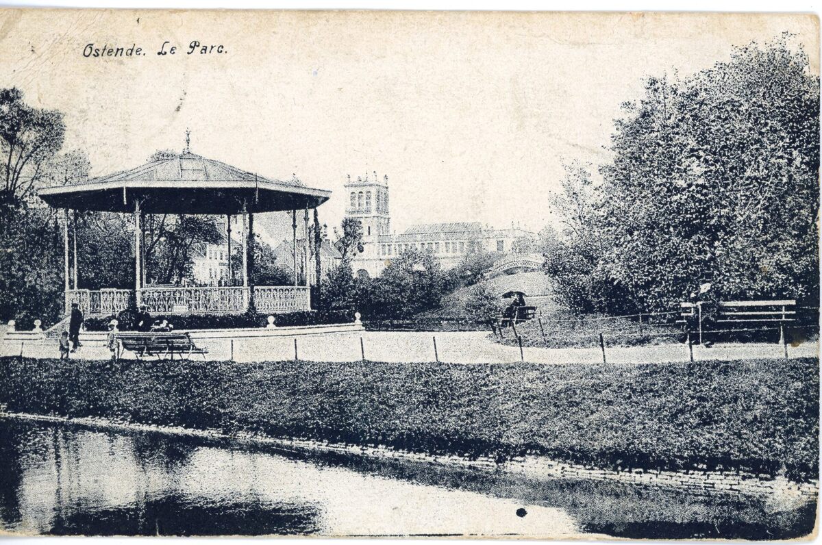 De muziekkiosk in het Leopoldpark. In de achtergrond, het postgebouw in de Hendrik Serruyslaan