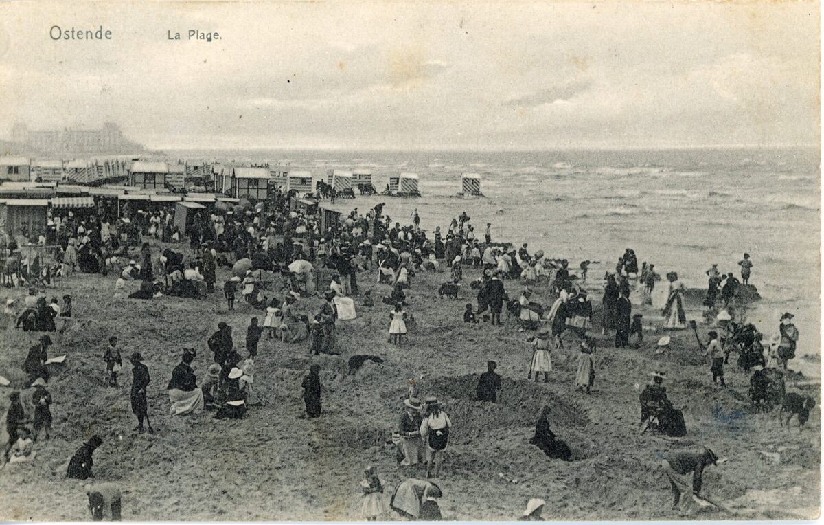Strandrecreatie op het groot strand. We zien het strand ten westen van het Kursaal richting Het Royal Palace Hotel