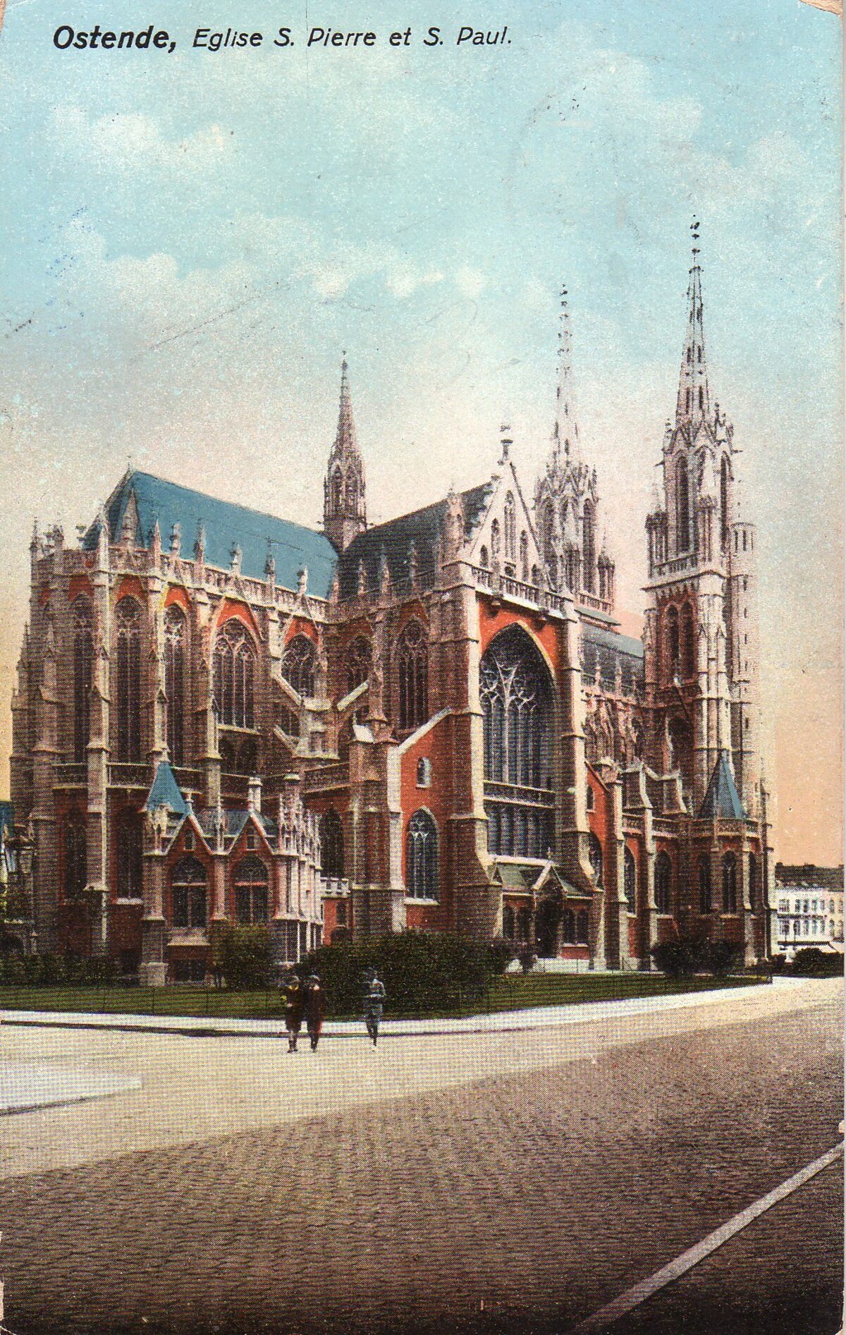 Le Bon. - Ostende - Eglise St Pierre et Paul. Bijgekleurde kaart. Vooraan, de Jozef II-straat