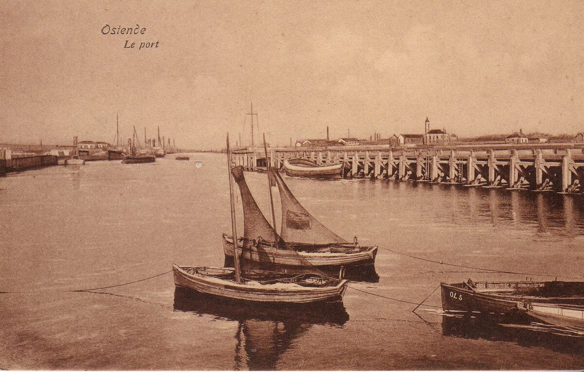 Edit. V.G.[= Victor Grégoire], 42, Avenue du Midi, Bruxelles. - Ostende - Le port. - Oostendse schovers gemeerd in de voorhaven. Wat verder links, pakketboten van de Oostende - Doverlijn gemeerd nabij het eerste Zeestation. Rechts, de Oosteroever, met de oude Vuurtorenwijk en de tweede vuurtoren.