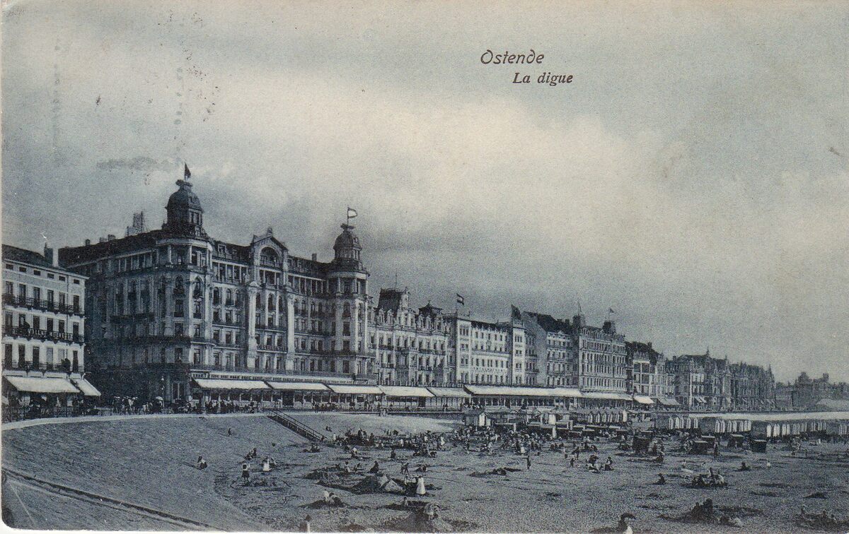 Edit. V.G. [=Victor Grégoire], 42, Avenue du Midi, Bruxelles. - Ostende - La digue. - De Zeedijk gezien vanaf het Kursaal richting het Koninklijk Chalet. Strandrecreatie op het Groot Strand
