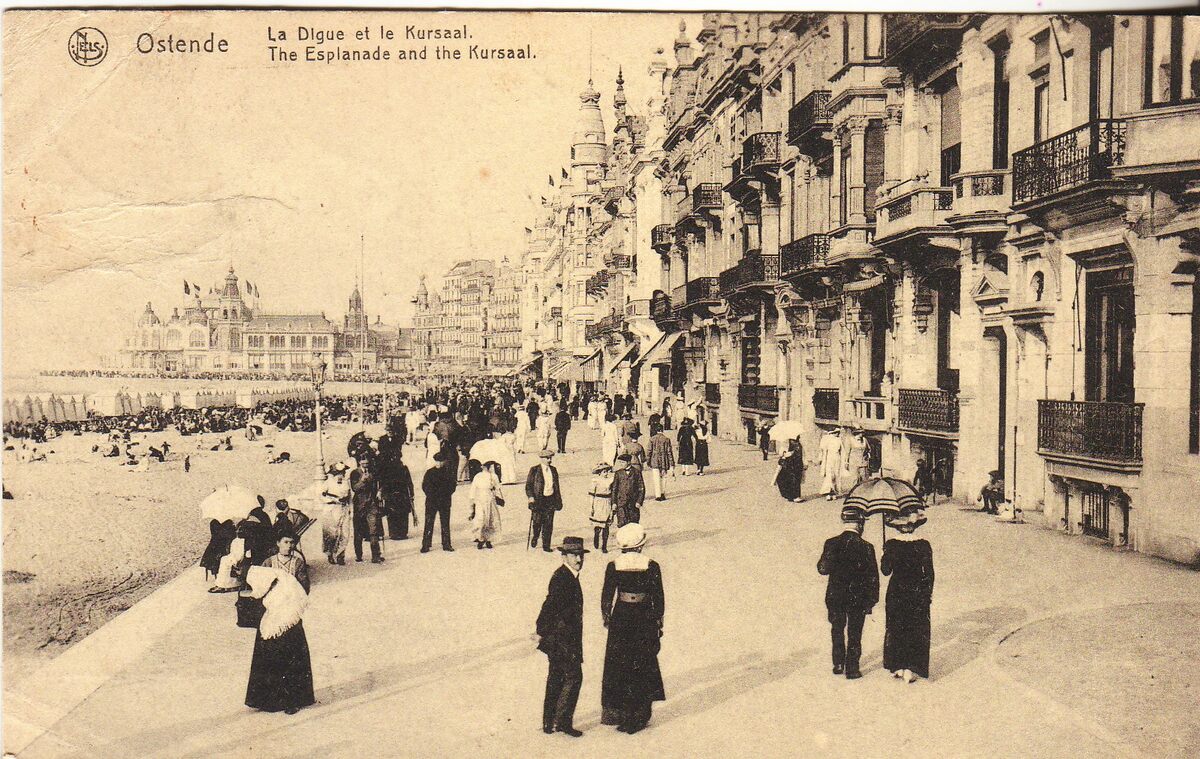 Nels. - Ostende - La Digue et le Kursaal. The Esplanade and the Kursaal. - De Zeedijk, richting de westgevel van het derde Kursaal. Links, het Groot Strand en de traditionele badkarren.