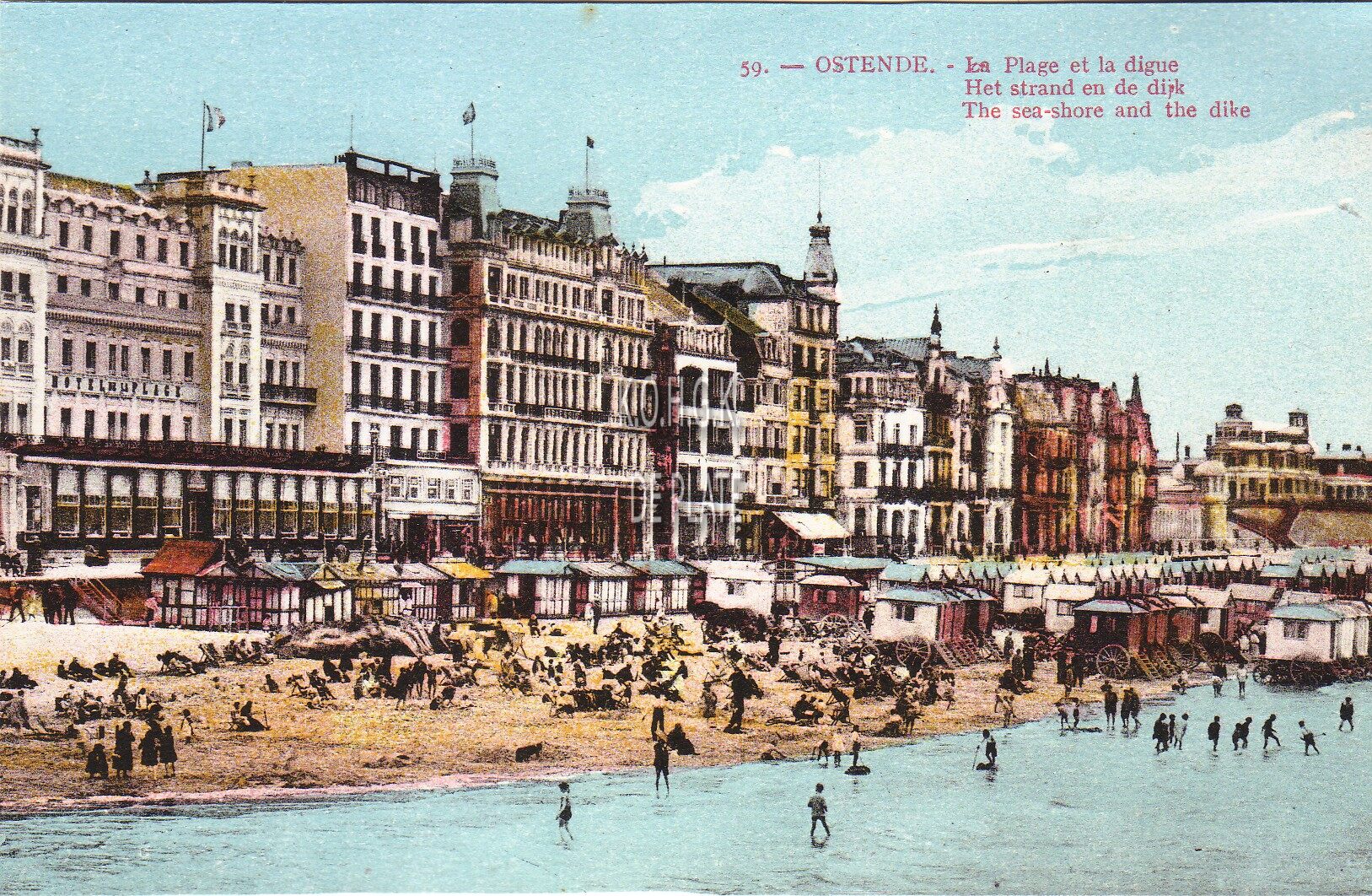 Bijgekleurde kaart. - De Zeedijk en de grote hotels ten westen van het Kursaal, met rechts het Koninklijk Chalet. Vooraan, strandrecreatie op het Groot Strand.